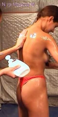 MessyMegan got rubbed down on an inflatable covered with shaving cream by LeRex